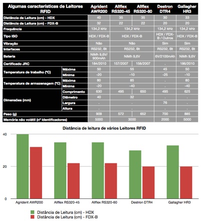 Partindo do principio que o tipo mais representativo de "leitor estúpido" é o leitor tipo “bastão”, na nossa Lista de Leitores RFID, divulgada nas Notícias de 25 de Janeiro de 2011, são apresentados modelos de várias marcas, alguns dos quais são utilizáveis através do nosso RFID Integrator, pelo que no quadro e gráfico seguintes se podem comparar algumas das suas características, sem no entanto se dever dispensar a consulta dos folhetos e manuais, ou melhor ainda a testagem específica a campo.